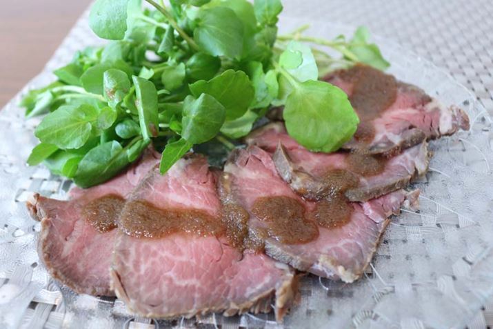 クレソンを添えて、付けダレを煮つめたソースをかけて立派なひと皿が完成。使用した肉は100g700円ほどのもの。最高級肉というわけではないですが、悪魔的うまさで300g一気にいけそうでした