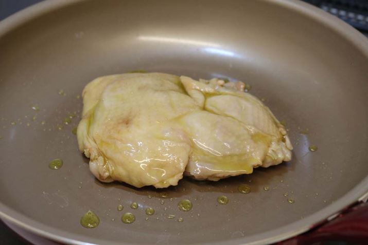 3時間後、いったん冷ましてオイルから取り出した鶏肉はこんな状態。残念ながらコンフィはこれで完成ではありません。仕上げにフライパンでこんがり焼いたら完成です