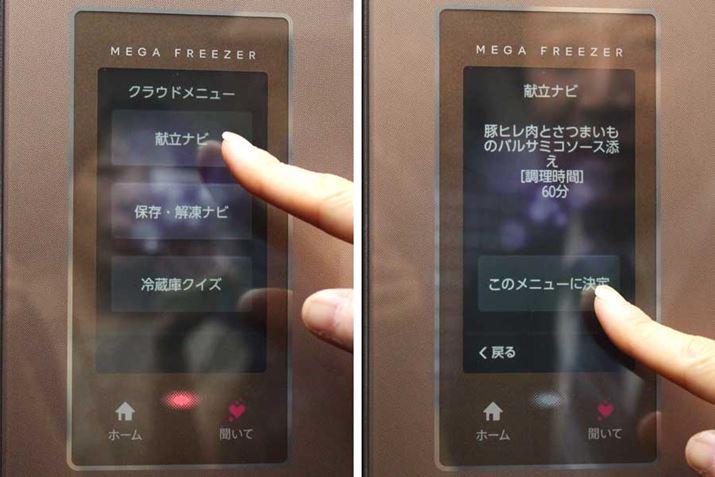 さらにこの“電動フレンチドア”のGXシリーズにはもうひとつ大きなポイントが。何と、無線LANと発話機能を搭載しているのです! 冷蔵庫本体が家庭内のWi-Fiネットワークと接続することで、シャープが提供するクラウドサービス「COCORO KITCHEN」と連携することが可能。クラウド上にある料理レシピから、おすすめのものを冷蔵庫が選択して、ドアに搭載している液晶ディスプレイに表示しつつ音声で教えてくれたりします。