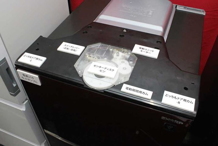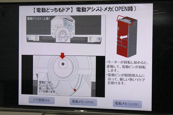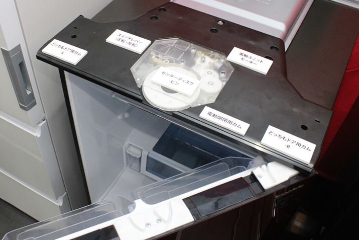 冷蔵庫のドアが右開きか左開きかというのは、製品の設置場所に大きく関わるポイントです。そこで約30年前、シャープは1枚のドアが左右のどちらにでも開く“どっちもドア”の付いた冷蔵庫を独自開発。これまでに市場でも高い評価を受けてきました。そして今回、新開発の電動回転機構を採用することにより、“どっちもドア”の電動アシスト化に成功したのです。
