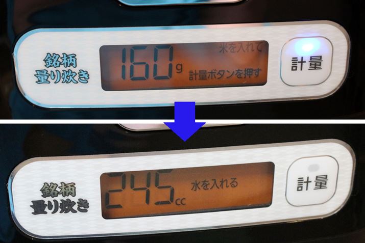 米を入れると、液晶モニターには「160g」と表示されました。これが、米の量。この状態で「計量」ボタンを押すと、必要な水の量が表示されます(今回は、245cc必要)