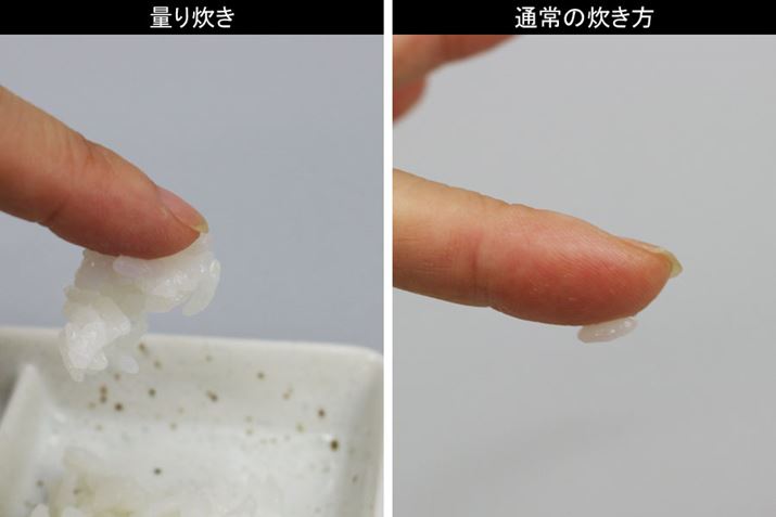 しかし、このもちもち感を写真でうまく伝えられない! そこで、指でそれぞれのごはんを触ってみました。「量り炊き」のほうは粘度があるのでたっぷり指にくっつきましたが、通常の炊き方のほうはほとんどくっつかず