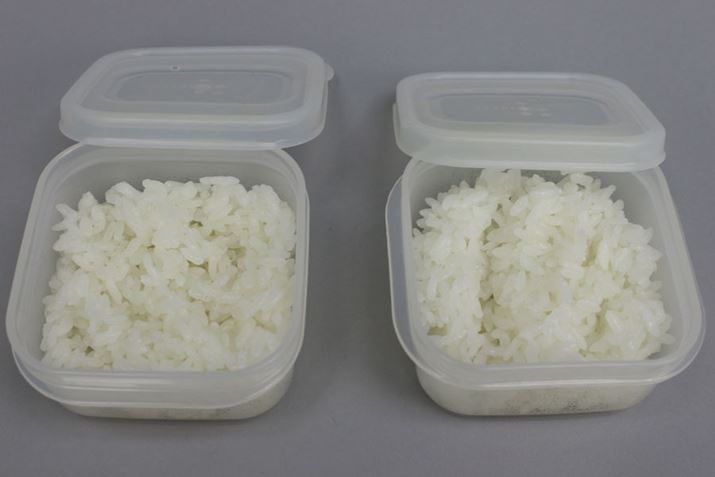 弁当箱に入れ、6時間経過したごはんを食べてみました。見た目には差はありませんが、炊きたて同様に「量り炊き」のほう(右)がもちもちしており、甘みも強い印象