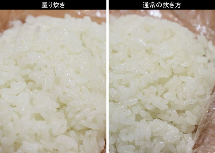 炊き比べの結果を見ると「量り炊き」のほうが粘度はありそうだけれど、やわらかそう……と思われる方もいるでしょう。しかし、もちもちとしつつも、粒感もしっかりあり! 硬めのごはんが好きな筆者でも文句なしの食感です。このように伝えると、通常の炊き方のほうのごはんは硬くていまいちな炊き上がりといった印象を受けますが、「量り炊き」で炊いたごはんを食べていなければ、十分満足のいく味わいでした。
