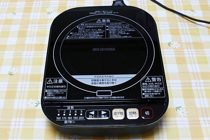 IHクッキングヒーターは「加熱」ボタンを押したあと、「強く/弱く」ボタンで約80W、約200W、約500W、約700W、約1,000Wで火力を切り替え可能。また、「揚げ物」ボタンを押してから「強く/弱く」ボタンで約160℃、約170℃、約180℃、約190℃、約200℃を選択すると、揚げ物油の温度が設定した温度をキープできるように自動調整してくれます