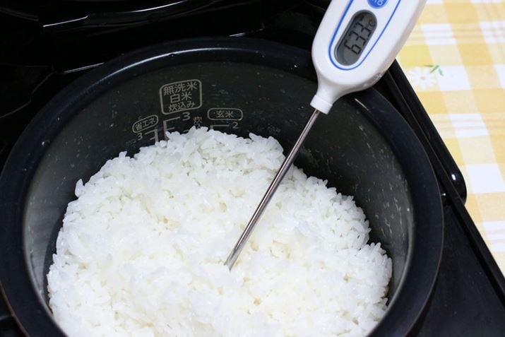 炊き上がって保温になっている炊飯器を外し、おかずを作ることにしました。炊飯器のごはんが何℃になるのかも後ほどチェックします