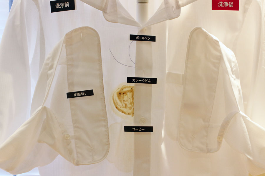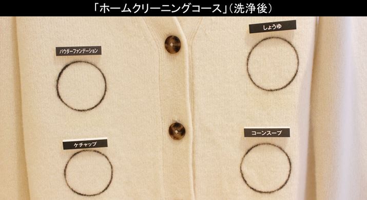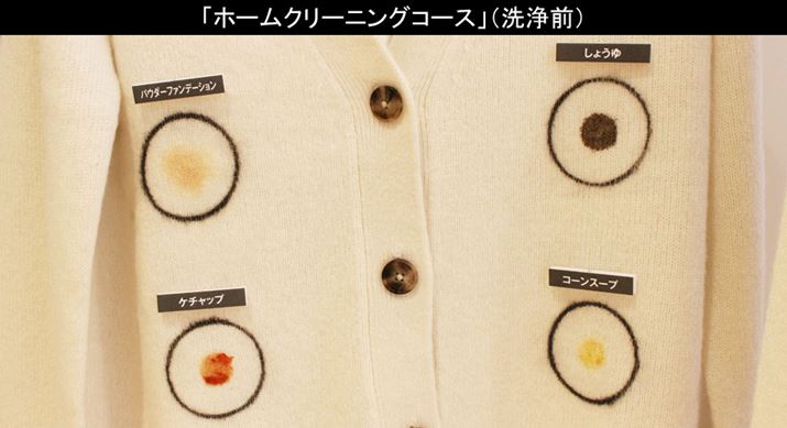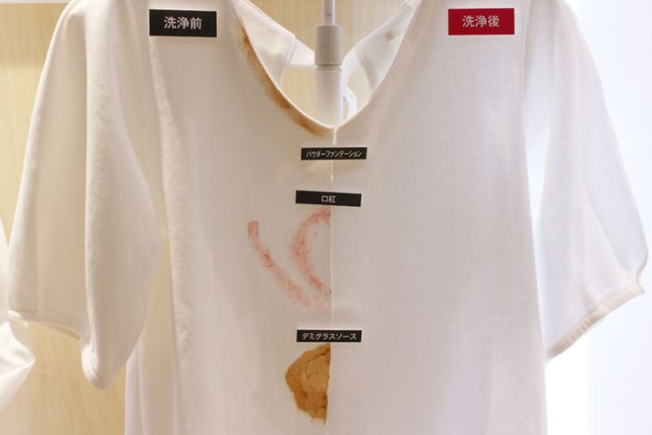 こちらも、「超音波ウォッシャー+10分洗浄コース」で洗濯した衣類。超音波ウォッシャーの洗浄力がすぐれているので、パウダーファンデーション、口紅、デミグラスソースの汚れもまっしろに!