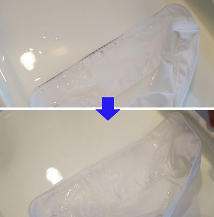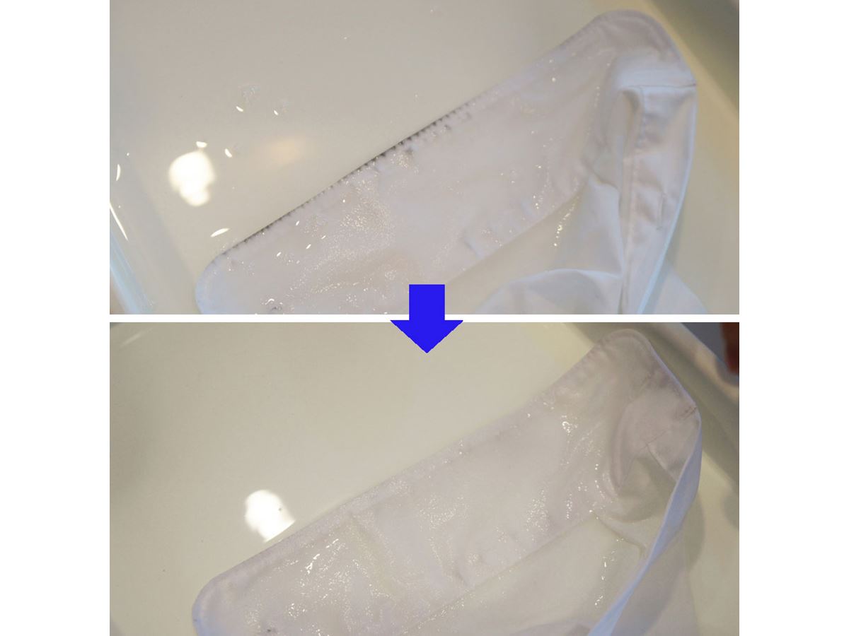 超音波ウォッシャーで汚れを落とすには、汚れの付いた部分を水に浸し、その上をなぞるだけ(下の動画参照)。泡の発生と破裂(消滅)を短時間で起こす「キャビテーション効果」により、繊維から汚れを剥がし落とします。