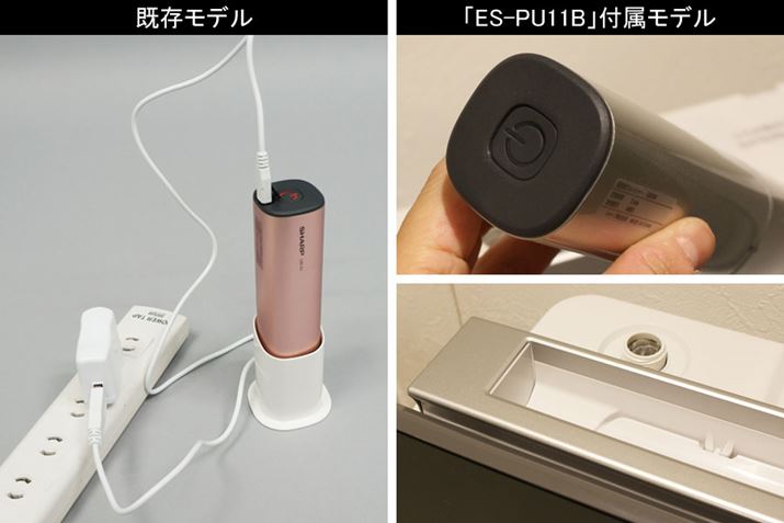 既存モデルは電源コードを差して充電しますが、ES-PU11B付属の超音波ウォッシャーは非接触給電を採用。ワイヤレスなのでコードを抜き差しする手間がなく、使いたい時にサッと手に取れるのは魅力ですね