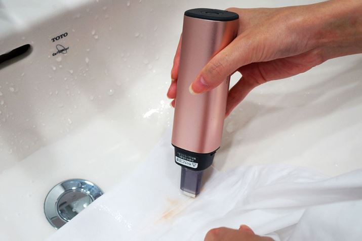 片手で持てるほど小さなボディながら、洗浄力は上々。既存モデルで筆者が試したところ、袖口に付いた汚れ、ファンデーション、泥、コーヒー、赤ワインなど多様な汚れが落とせました