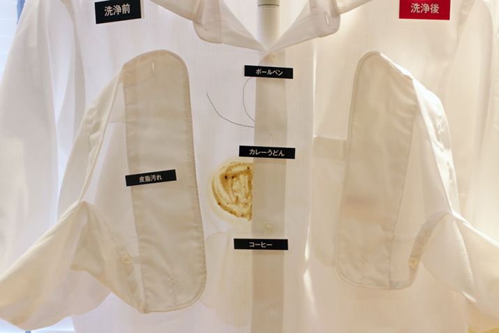 ボールペン、カレーうどん、コーヒー、皮脂汚れを超音波ウォッシャーで落としてから10分洗浄コースで洗ったワイシャツ。汚れは視認できないレベルでキレイになりました