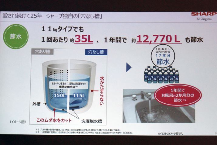 ここからは、ES-PU11Bの基本性能について紹介しましょう。ES-PU11Bの洗浄や乾燥方法は従来と同じで、今年で誕生から25年となるシャープ独自の機構「穴なし槽」も健在。一般的な縦型洗濯機は内槽と外槽の二重構造になっており、内槽の穴から水が外槽に流れ出てしまうため多くの水が必要になるのですが、穴なし槽は給水した水が漏れることがなく、節水効果が高いと定評があります。また、外槽の汚れやカビが侵入してくる心配もありません。さらに、洗濯時には水流の勢いを加速させる効果もあり、洗濯物を上下に入れ替えながらしっかり洗うことができるとのことです(下の動画参照)。