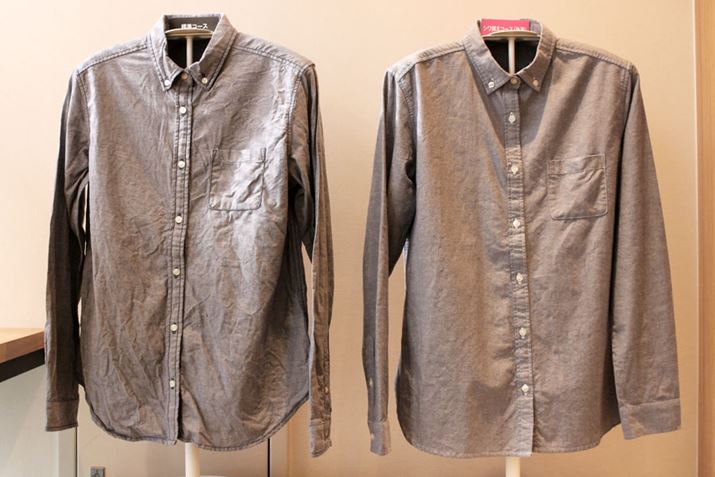 標準の乾燥コースを利用した綿100%のワイシャツ(左)は、前身ごろや袖にシワが目立ちます。襟もヨレている印象。いっぽう、「シワ抑え」乾燥コースで乾かしたワイシャツ(右)は、アイロンをかけたかのようにパリッとしていますね
