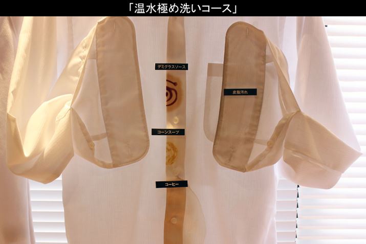 コーヒーやデミグラスソースといった食事中に付きがちな汚れも、袖口の皮脂汚れにも「温水極め洗いコース」が役立ちます