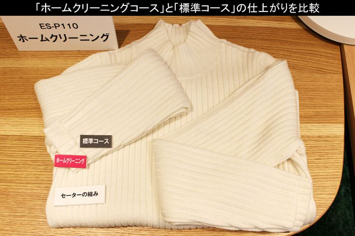 ES-P110に搭載されている洗濯コースの一部を紹介します。デリケートな生地の衣類には「ホームクリーニングコース」がうってつけ。基本的にはマイクロ高圧洗浄で汚れを落とす洗浄方法なので、衣類が傷みにくく、縮みの低減も望めます