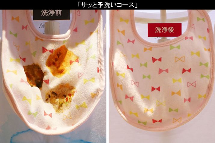 汚れが激しく、ほかの洗濯物と一緒に洗いたくない時には「サッと予洗いコース」を活用してみましょう。5分間、洗剤を使わず洗うコースで、気になる汚れを素早く洗い流してくれます。あとは、ほかの衣類とあわせて洗濯すればOK