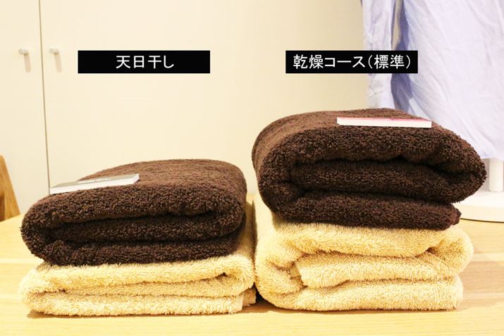 天日干ししたバスタオルと「ハイブリッド乾燥」で乾かしたバスタオルを比べてみると、ふっくらさにも大きな差がでました。乾燥コースを利用したほうがパイルの立ち上がりがよく、肌触りもよさそうです