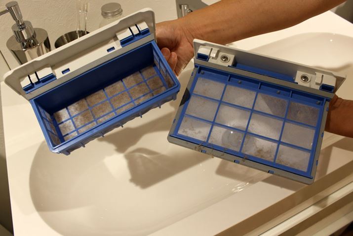 最後に、フィルターのお手入れがラクにできるようになったので紹介させてください! 天面に装備されている乾燥フィルターは前後に2つあるのですが、従来は手前側しか取り外すことができず、後ろのフィルターを掃除したい時には狭いすき間から手を入れて行わねばなりませんでした。しかし、ES-P110ではこれも簡単に取り外し可能に! 取り外して布で拭いてキレイにできるので、手軽さは劇的に向上しました。
