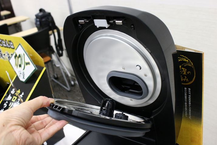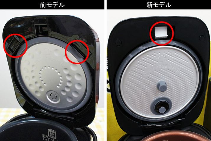 炊飯プログラムなどは従来と同じですが、お手入れがラクにできるように工夫されました。前モデルでは2か所をつまんで内フタを外さなければいけなかった仕様が、新モデルではロックを上にスライドさせるだけで取り外し可能に!