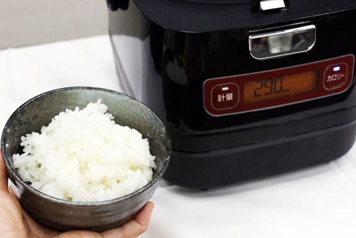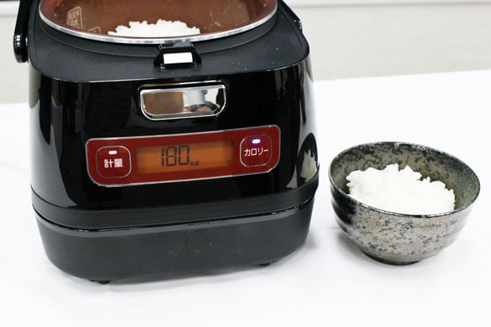 炊飯部とIHクッキングヒーターとしても使える発熱部が分離できる構造になっている「銘柄量り炊き」には、米の種類にあわせて必要な水量を計測する「量り炊き」機能が装備されています。「量り炊き」機能を知らない方のために簡単に説明すると、米の銘柄を指定してから米を内釜にセットすると、適切な水の量が表示され、その数字を見ながら「OK」の表示になるまで水を注げば水の過不足なく炊飯できるというもの。たとえば、1合を炊く場合、水量が±5g以上あると味に変化が出てしまうのだそう。実際、内釜内の目盛りピッタリに水を入れたとしても、8割以上の人が5g以内の誤差に収めることはできないという検証結果も出ているほど水量の計測はシビアなのです。実は、筆者も前モデルで「量り炊き」機能を体験したのですが、内釜の目盛りを利用した計測とでは炊き上がったごはんの味がまったく異なりました。使う前は実感するレベルで違いが出るとは思っていなかったので、「量り炊き」機能の有用性は高いといえます。そんな「銘柄量り炊き」の新モデル「KRC-ID30-R」は、水の計量だけでなく、カロリーも計測できるようになりました。お茶碗によそったごはんの量からカロリーを算出して教えてくれます。