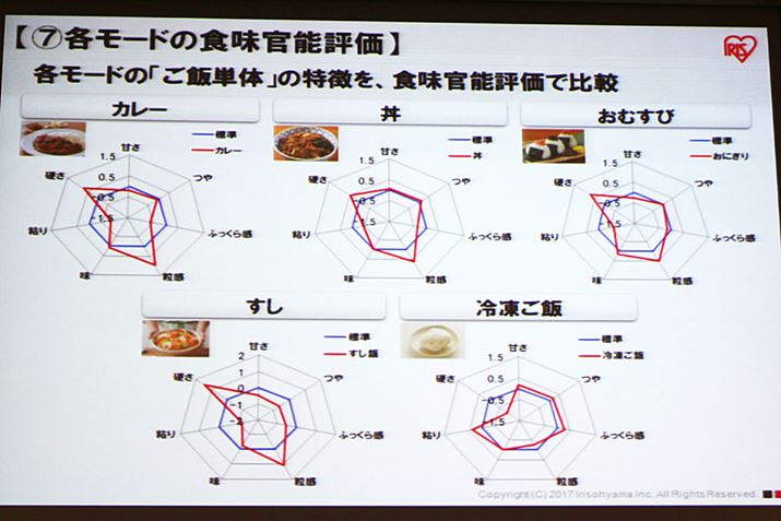 ここからは、アイリスオーヤマ初の圧力IH炊飯器「銘柄炊き KRC-PA50-B」の紹介に移ります。KRC-PA50-Bの大きなウリは2つ。ひとつは、銘柄を指定して炊き上げる「銘柄炊き」機能が搭載されていることです。「銘柄炊き」は銘柄にあわせて加熱工程と加圧時間を調整して炊くというものですが、この仕組みは上位モデルのIH炊飯器ではめずらしいことではありません。ただし、その調整具合(炊飯プログラム)はメーカーごとに異なります。アイリスオーヤマはもともと精米事業からスタートしているので、炊飯器を開発するためのデータだけでなく、精米してどれほど経過したかによる米の変化、地域ごとの米の特性など膨大な情報を保有しているのが強み。その知見を炊飯器に活用することで、米本来のおいしさを引き出した炊き上がりを実現しました。