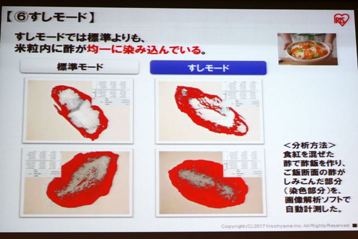 「すし」モードでは、標準モードで炊くよりも酢が芯まで染み込んでいます。表面上にしか染みていない場合、口にふくんだ時に「すっぱい」味覚を強烈に感じてしまいますが、中までしっかり浸透しているとまろやかな酸味となるそう
