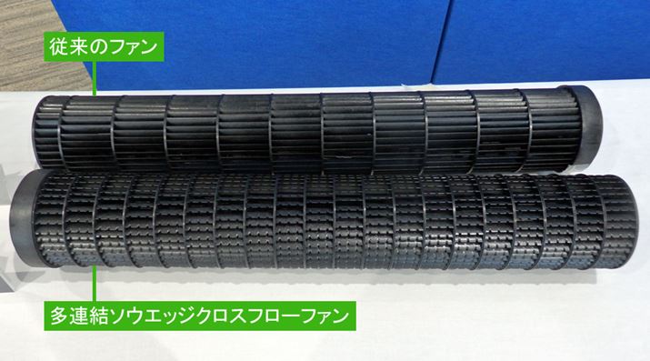 従来のファンよりも連結部を増やし、ファンの翼にスリットを施した「多連結ソウエッジクロスフローファン」は静音性だけでなく、送風効率の改善にも役立っているといいます