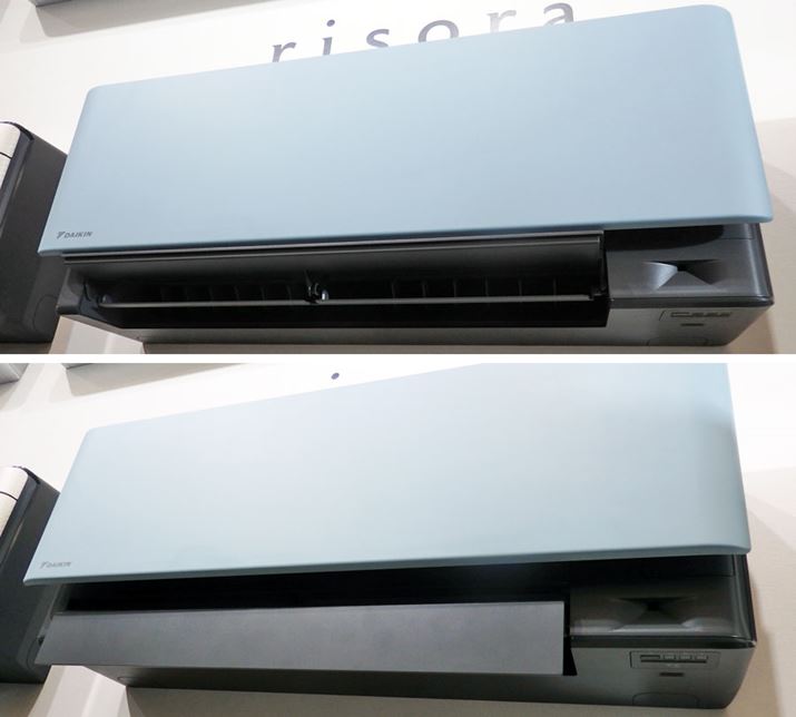 冷房時に上方向に気流を放出する「天井気流」(上)や、暖房時に真下に暖気を吹き出す「垂直気流」(下)でも、メカメカしさを感じさせません