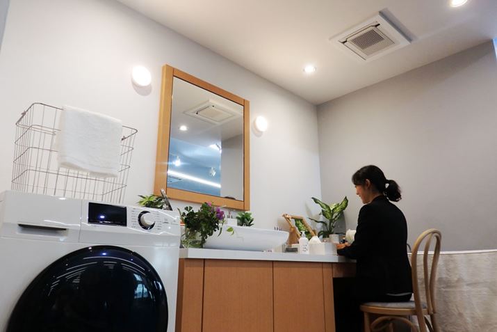 サニタリールームに「ココタス」を設置したイメージ。素早く設定温度にしてくれる「パワフル運転」と不在時にムダな運転を抑える「ひかえめ運転」も搭載しています