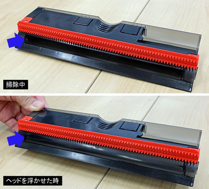 掃除中はゴミを取り込むためにダストケースのシャッターが開いていますが、ヘッドを床から浮かせるとシャッターが閉まります。これにより、持ち運び時のゴミこぼれを抑制