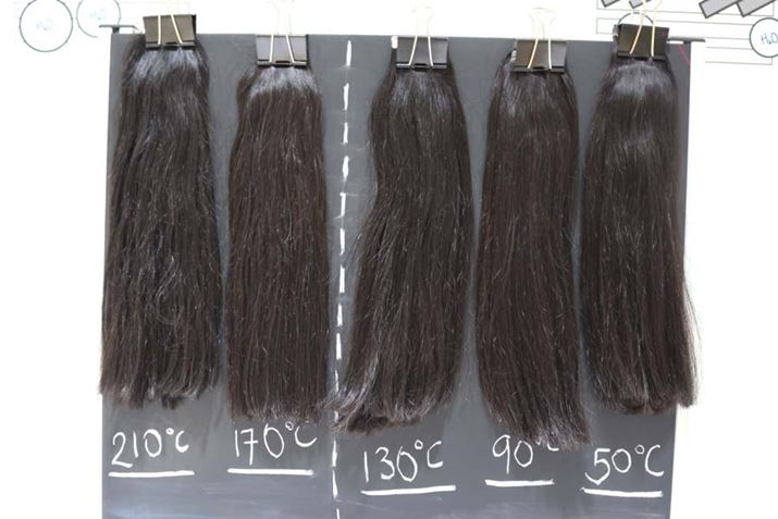 50〜210℃の5段階の温度帯でそれぞれ複数回乾かした髪のサンプル。50℃で乾かしている髪はまとまりとツヤがあるのが写真でもわかる。触ってみると、50℃で乾かした髪のなめらかさと、210℃で乾かした髪のざらつきは衝撃的な差だった