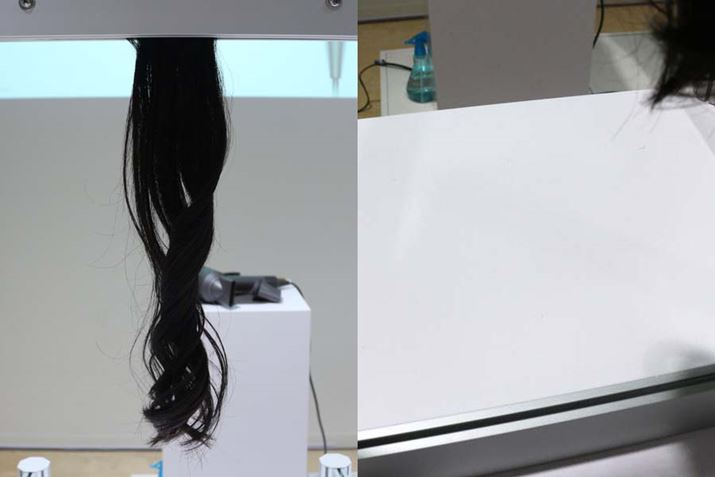 髪に少量の水をたらす実験では、健康な髪の毛は水をはじくような反応を見せるが(左)、傷んだ髪の毛は水を吸収してしまう(右)。キューティクルがはがれている証拠で、ダメージを受けやすい状態になっているという