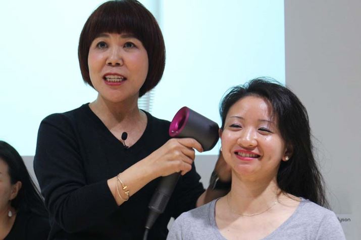 ヘアーメイクアップアーティストの山本浩未氏(左)。「Dyson Supersonic」で上手に乾かすコツは、風量、温度ともにMAX。1方向からでなくいろいろな方向から風を当てること。根元から立ち上がるような自然なボリューム感が出て、柔軟性があり、スタイリングをしやすい仕上がりになるという。また、最後に冷風で仕上げると手触りがなめらかになり、寝癖もつきにくいそう
