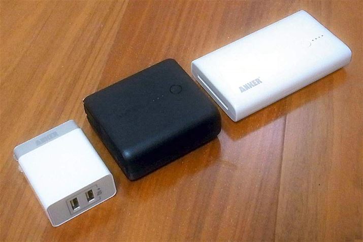 筆者が日常的に使っている、Ankerの2ポートUSB-AC充電器(左)と5000mAhタイプのモバイルバッテリー(右)と並べてみました