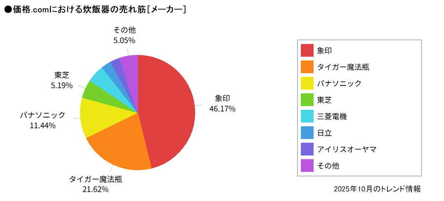 価格.comで炊飯器の売れ筋をメーカー別でチェックしてみると、象印が約46%、タイガーが約22%と、この2メーカーだけで全体の7割近くを占めています。加熱方式などで分類していないため、マイコン式から圧力IHまで幅広い容量のラインアップを揃えるメーカーが強い印象。このグラフは2025年10月のものですが、通年で、割合はそれほど大きく変わっていません。