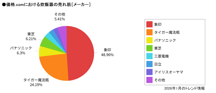 価格.comで炊飯器の売れ筋をメーカー別でチェックしてみると、象印が約49%、タイガーが約24%と、この2メーカーだけで全体の7割以上を占めています。加熱方式などで分類していないため、マイコン式から圧力IHまで幅広い容量のラインアップを揃えるメーカーが強い印象。このグラフは2026年1月のものですが、通年で割合はそれほど大きく変わっていません。