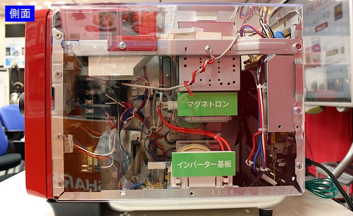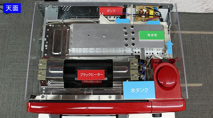 いっぽうレンジ機能で加熱する際には、マグネトロンが振動してマイクロ波を発生させ、天面にある導波管から庫内の食材に放射されます