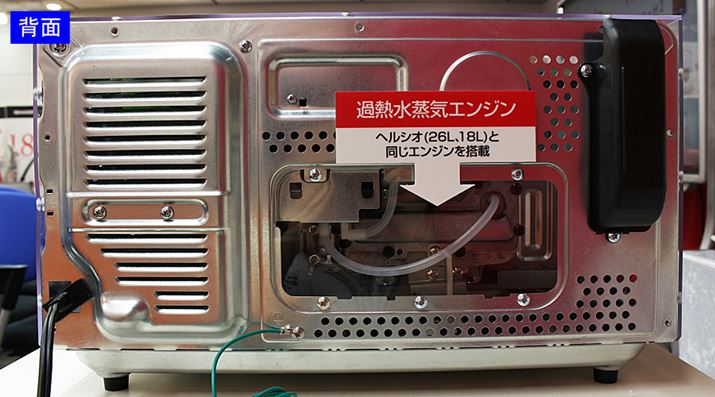 過熱水蒸気による調理では、水タンクに入っている水が過熱水蒸気エンジンまで流れ、高温の水蒸気になって庫内に噴出する仕組み。なお、この過熱水蒸気エンジンは庫内容量26L、18Lのウォーターオーブン「ヘルシオ」(AX-AW400/AX-AP400/AX-CA400)と同じものとなります