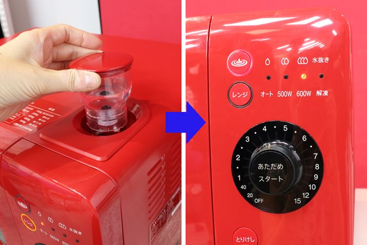 レンジ機能を使いたい時にはドアを開けるだけ。温度センサーが搭載されているので、「オート」でも的確なあたためができるそう。もちろん、ワット数(500W/600W/解凍200W相当)を指定することもできます