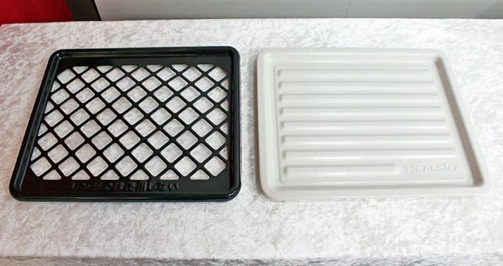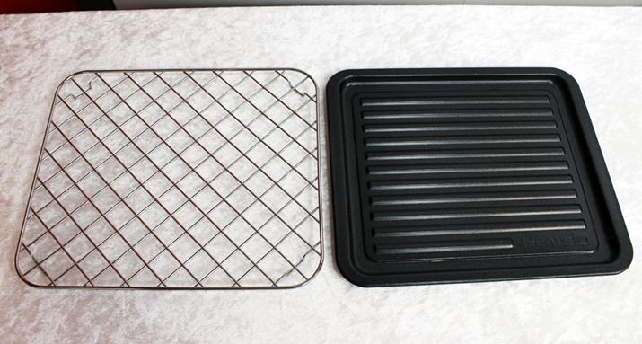 調理中に使用するトレイ(右)はセラミック素材となりました(ヘルシオグリエは金属素材)。セラミックの遠赤外線効果も調理に作用するようです。また、トーストなど裏面に焼き色を付けたいメニューのためにホーロー素材の焼き網(左)も付属