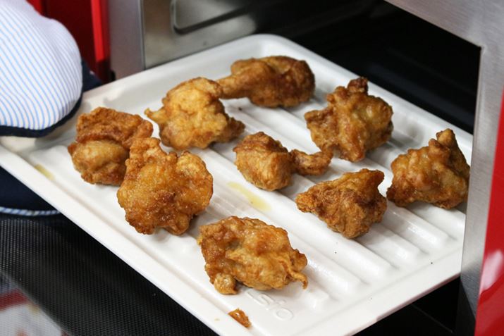 揚げ物を主とする惣菜のあたためは、過熱水蒸気の得意とするところ。さっそく、から揚げをあたため直してみました