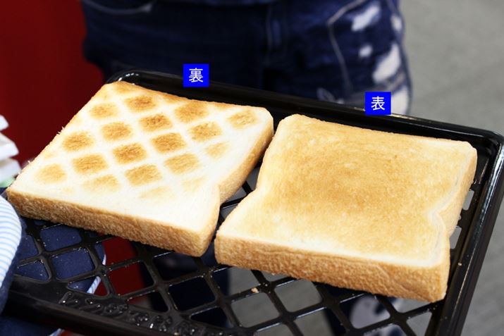 ホーロー焼き網に載せて食パンを焼くと(過熱水蒸気「強」で約4分)、裏面に格子模様の焼き目のついたトーストができました。サクサクと軽い食感で、クラスト(パンの耳の部分)がバツグンにおいしい!