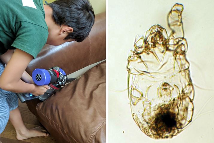 そしてソファで取れたゴミの中には、ぜんそくやアトピーの原因となるコナヒョウヒダニ(左)と、近年、アレルギー症状を引き起こす要因となるといわれているチャタテムシも含まれていました