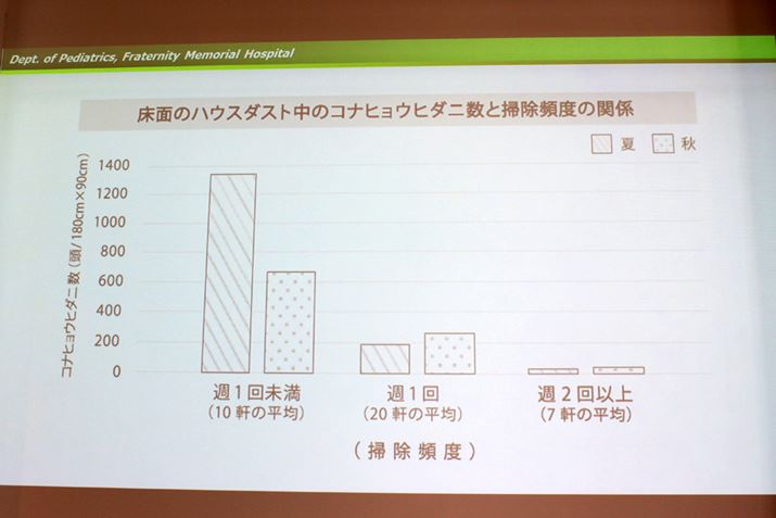 実は、この自宅のダニ調査は、ダイソンがアレルギーに関する知識を深めるために開催したイベントのひとつとして実施したもの。当イベントには同愛記念病院・小児アレルギーセンター長の増田 敬氏が出席し、アレルギーにまつわるレクチャーをしてくれたのですが、その中でも掃除機がけの頻度を増やすことがアレルゲン減少につながることが語られました。ダニは繁殖のスピードが速く、たとえば、チリダニの一種「コナヒョウヒダニ」のオスとメスを各10匹ずつ容器に入れて培養したところ、2か月で約150倍の3,110匹に増加したそう。アレルギーの原因となるアレルゲンは、生きているダニだけでなく、死がい、フンなども含まれることを考えると、いかにふだんの掃除が大切かがわかります。