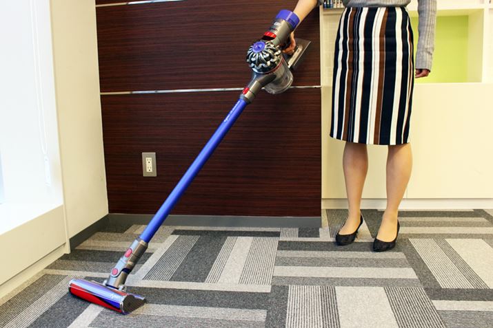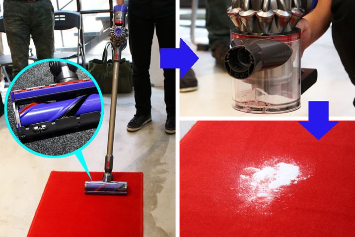 コードレススティック掃除機はキャニスター掃除機よりも吸引力が弱く、ゴミがきちんと取りきれないような印象を持たれますが、「V8」には1分間に最大11万回転するモーターが搭載されており、高い吸引力を発揮します。下の動画にあるように、ダイソンのイベントで電源コード付きのキャニスター掃除機とゴミの取れ具合を比較してみたところ、「V8」は溝に入った微細じんまでキレイに吸い取りました。