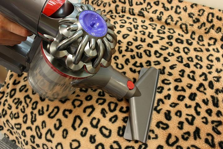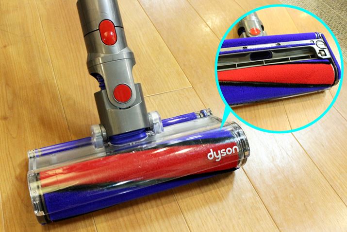 「V8 アブソリュート」には2つのヘッドが付属していますが、ここではフローリング掃除に最適な「ソフトローラークリーナーヘッド」を使用。フワフワとしたナイロンフェルト繊維が大きなゴミを捕らえ、カーボンファーバーブラシ(黒い部分)が静電気を抑えることで細かいゴミも取り逃しません