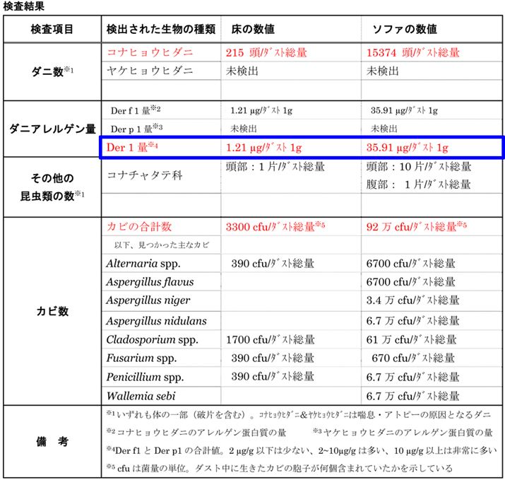 青く囲んだ部分で示したダスト1gあたりの数値が2μgであればダニは少なく、2〜10μgは多い、10μg以上は非常に多いとなるようです。編集部員A宅の床は問題ないようですが、ソファは35.91μgとかなりヤバイ状態!