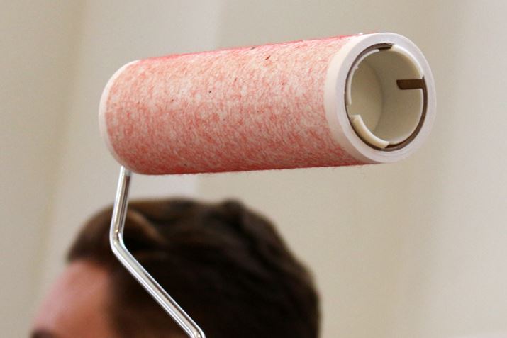 ゴミはまったく見当たらない真っ赤なカーペットを、粘着カーペットクリーナーで掃除