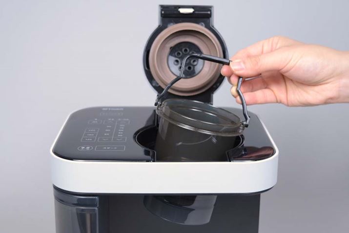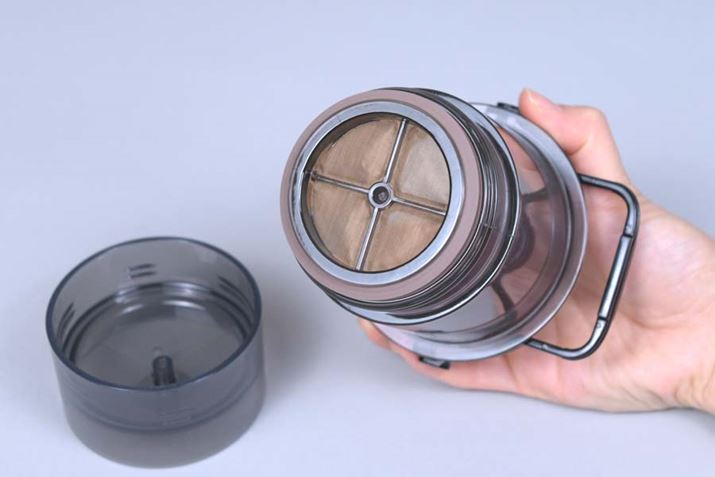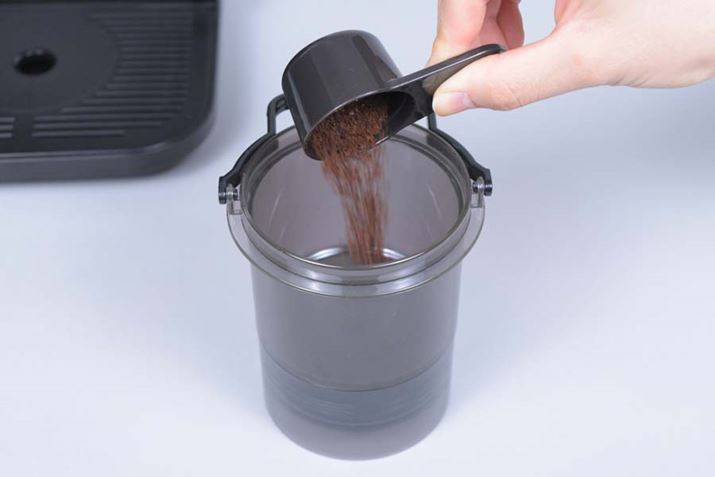 フィルターを内蔵したシリンダーにコーヒー粉を投入。1度に淹れられる量は60mL(アイス用)、120mL(1人用)、180mL(マグカップ用)、240mL(2人用)の4段階から選択でき、計量スプーンすり切り1杯(10g)でコーヒーカップ1杯分となる
