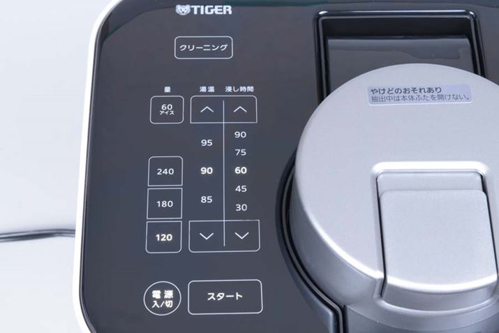 電源を入れ、タッチパネルで抽出量、抽出温度、浸し時間を選択すれば準備完了。スタートボタンを押せば抽出が始まる